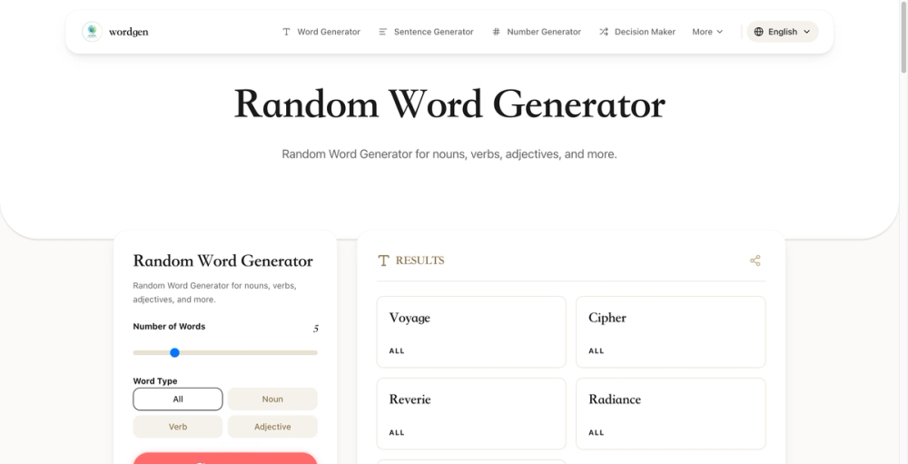 Random Word Generator results work well for naming, brainstorming, and testing UI copy. It is especially useful when you want quick keywords without overthinking.