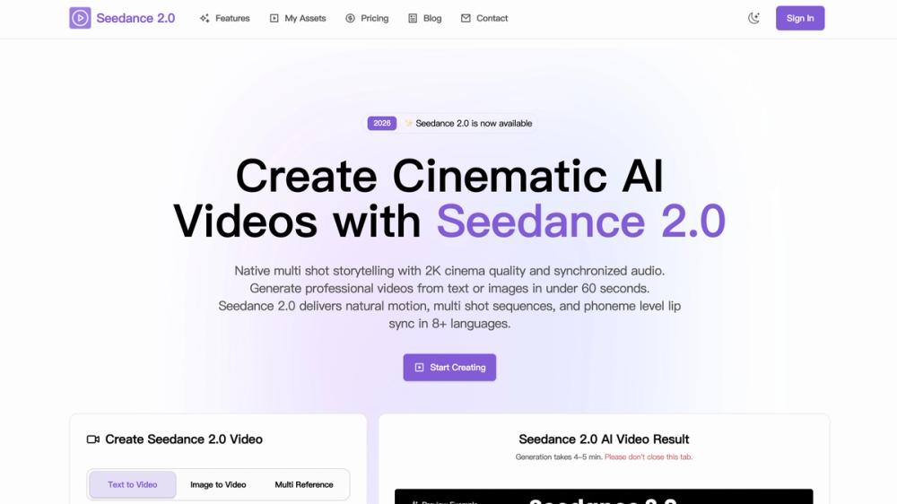 Seedance 2.0 is an advanced AI video generator that creates cinematic, multi‑shot videos from simple text prompts or single images in under 60 seconds. Using a Dual Branch Diffusion Transformer architecture, it generates video and native audio simultaneously, delivering up to 2K cinema‑grade resolution in multiple aspect ratios for any platform.